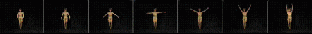 Under the seventh frame lies another set of stills which can only be seen consecutively, rendering part of the same original phrase fragment. Once this is downloaded into cache memory, it becomes a sparsely articulated sequence of some 20 frames or so shown sequentially over about five seconds, and it’s the closest you get to actual choreographed ‘movement’ in that it has a pre-arranged order, direction and timing and can’t be manipulated by the viewer, only stopped. This ‘movement’, however, doesn’t correspond directly to the frames because it may have been shot from a different angle, or from a different performance. Further, it doesn’t make use of the whole ‘phrase’, only a part of it.