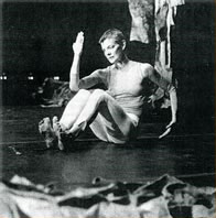 At the Saturday matinee, James Moore performed a different, no less important, more febrile interpretation. The difference between the two interpretations was not simply one of gender. Moore's long torso and short legs are uniquely suited to Fenley's work. He performs minute movements that resonate throughout the theater. His listening skill is amazing; the right palm cups over the top of the ear, and he oils his eardrum. Of course, that's impossible to witness, but I think you get the sense of how I saw an interior organ on the exterior of his body.